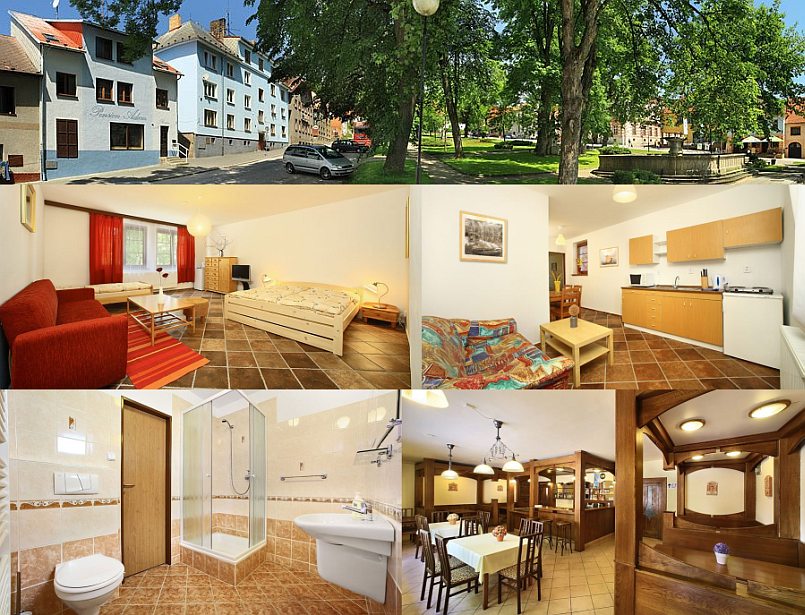 Цена: Sezóna (30.6.-31.8., 20.12.-7.1.): pokoj pro 5 osob 330 Kč/os/noc, pro 4 osoby 345-360 Kč/os/noc, pro 3 osoby 390-410 Kč/os/noc, pro 2 osoby 450-480 Kč/os/noc, apartmány 340-530 Kč/os/noc (min. 2 osoby). Mimo sezónu: pokoj pro 5 osob 250 Kč/os/noc, pro 4 osoby 245-290 Kč/os/noc, pro 3 osoby 280-295 Kč/os/noc, pro 2 osoby 290-335 Kč/os/noc, apartmány 265-370 Kč/os/noc (min. 2 osoby). Dítě 2-18 let sleva. Dětská postýlka 200 Kč/pobyt. Rekreační poplatek 21 Kč/os/noc (dítě 6 Kč/os/noc). Ceny jsou platné i při ubytování jen na 1 noc. Ceny jsou včetně DPH.