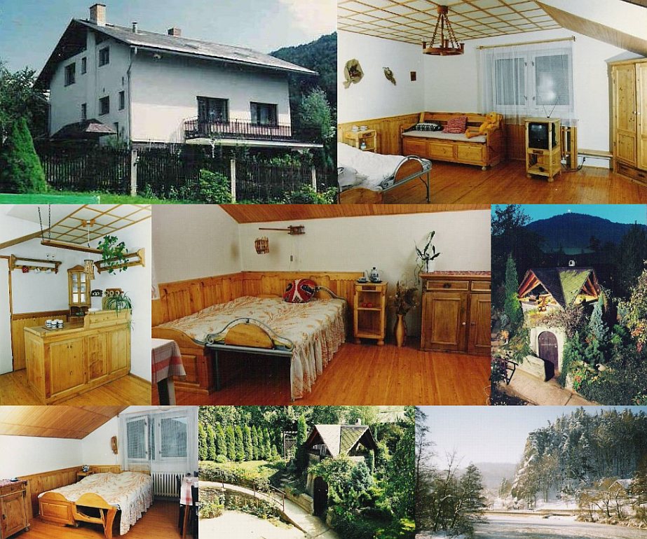 Размещение: Vila se dvěma 2-lůžkovými pokoji, 3-lůžkovým pokojem a 6-lůžkovým apartmánem. Všechny pokoje i apartmán mají vlastní soc. zařízení (WC, sprcha), TV a kuchyňský kout (lednička, mikrovlnka, varná konvice, vařič, nádobí, talíře a příbory). Útulnost pokojům dodává originální provedení nábytku a doplňků z přírodního dřeva. U vily je udržovaná zahrada ve svahu s romantickým výhledem na skalní hrad Panteon, s místy k posezení a s otevřeným ohništěm. Součástí zahrady je plně funkční malá kovárna a venkovní krb. Ubytovatel se celý život věnoval tradičním řemeslům, je uměleckým kovářem, pracoval při obnově památek v Praze a na zakázkách pro Národní divadlo. Oblíbil si práci se dřevem. Ukázky z této praxe uvidíte v prostorách ubytování.