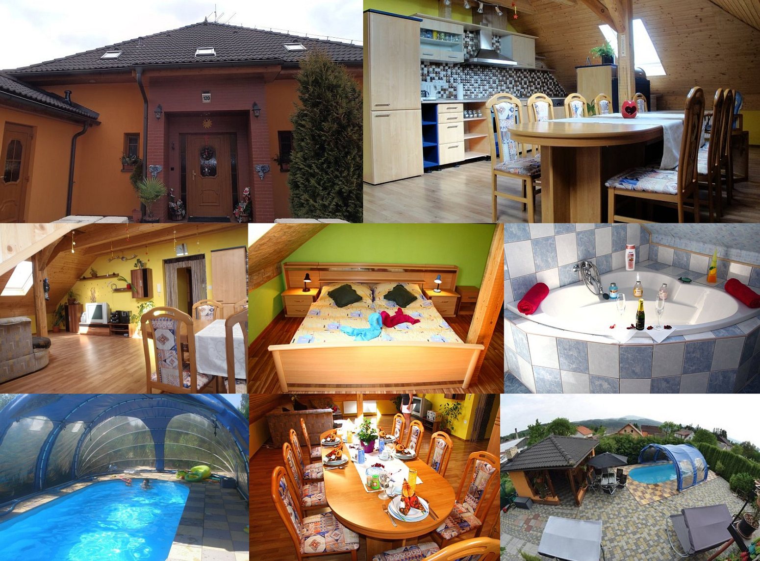 Размещение: Velký podkrovní apartmán v rodinném domu, se třemi ložnicemi celkem pro 10 osob (+ až 2 miminka), s výhledem na Boubín. Možný pronájem jednotlivých pokojů i celého apartmánu. V každé ložnici je manželská postel, TV, velká skříň a možnost přistýlky. Na vyžádaní dětská postýlka a stolička. Pro všechny pokoje je společná koupelna, WC, obývací místnost s rozkládacím gaučem (2 přistýlky), TV, DVD, hifi a plně vybavená kuchyň s jídelnou. Bezplatné WiFi v celém objektu. Před domem je venkovní posezení v altánu s krbem, zastřešený bazén, pro děti houpačky, skluzavka, pískoviště a dětský domeček.
