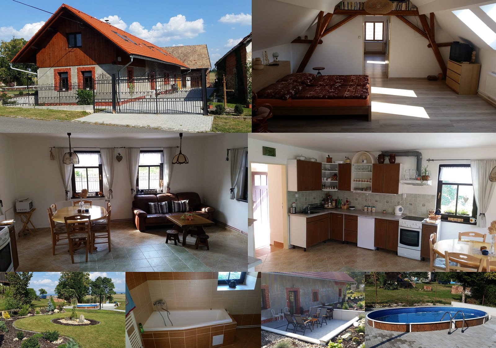 Размещение: Rekreační chalupa po kompletní rekonstrukci, max. pro 16-20 osob. V přízemí je obývák s plně vybavenou kuchyní (el. sporák s pečící troubou, mikrovlnka, lednička, varná konvice, jídelní stůl pro 6 osob, sedací souprava, krb s výměníkem a TV), hala se vstupem na terasu, rozkládacím lůžkem a posezením pro 4-6 osob, stará stylová ložnice (2-lůžková) a koupelna s WC. V podkroví jsou tři ložnice (1x2 lůžka + rozkládací gauč, 1x2 lůžka, 1x4 lůžka, možnost dalších 4 přistýlek na matracích). V okrasné zahradě je terasa (se zahradním nábytkem a grilem) a zapuštěný oválný bazén 3,6 x 5,6 m se solární sprchou.