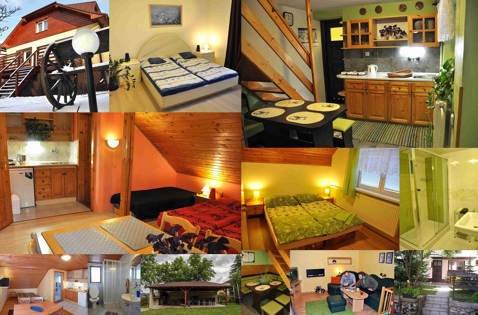 Размещение: Dva samostatné objekty (chalupa a chatka) s veľkou záhradou a uzavretým parkoviskom. V záhrade je možnosť posedenia a grilovania, k dispozícii je trampolína a stolný tenis. Malá chatka (6 osôb): V podkroví chatky sú 2 spáľne (1x3, 1x2 lôžka), na prízemí je izba s TV, kuchynka a sociálne zariadenie. Chatka sa prenajíma vždy celá. Veľká chalupa (15 osôb): V podkroví chalupy sú 2 rodinné apartmány (1x5 a 1x4 lôžka), každý apartmán má dve izby, kuchynský kút, sociálne zariadenie a TV. Na prízemí chalupy je apartmán s dvomi 3-lôžkovými izbami, jedáleň, kuchyňa, 2x sociálne zariadenie, TV.