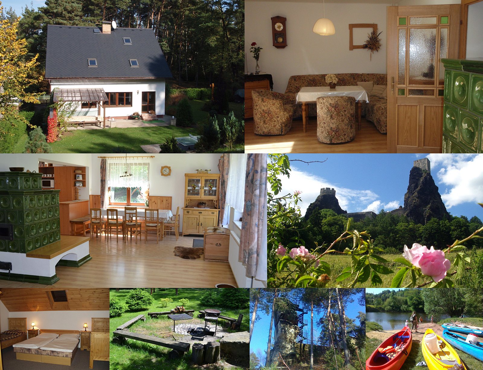 Размещение: Komfortní nová chalupa pro 18-20 osob v 5 pokojích (1x2, 4x4 lůžka + dětská postýlka) + podkrovní 6. pokoj na vyžádání (2 lůžka). Velký obývací pokoj s kachlovými kamny, prostorná kuchyň s jídelnou (mikrovlnka, myčka nádobí, 2 dřezy, 2 velké lednice, 3 varné konvice, kávovar, sporák). 3x koupelna + WC. Udržovaná oplocená zahrada, slunečná terasa s nábytkem + pergolou, přenosný gril, ohniště u lesa. Úschova kol + půjčovna v chalupě, kuželky, houpačka, lesní hřiště + míčové hry, stolní tenis v zahradě. Pes není povolen. V chalupě se nekouří. SEZONA 2014: WiFi + bazén v měsících 07+08.