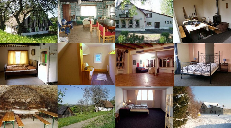 Chalupy byly ve druhé půlce roku 2012 prodány a ubytování se zde nenabízí! Fotografie v levé půlce složeného obrázku dokumentují chalupy, v pravé půlce velký dům.