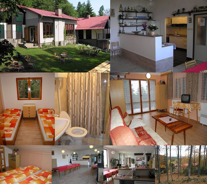 Размещение: Dvě chaty. Každá chata má 3 ložnice (2x2, 1x4 lůžka), obývací místnost (1 lůžko), koupelnu s WC, vytápění el. přímotopy. Společná terasa a velká společenská místnost (45 míst, 80 m2) s krbovými kamny, velkou TV, barem (presovač, chlazení s kompresorem), kuchyní (horkovzdušná trouba se sklokeramickou deskou, odsavač par, myčka, mikrovlnka, lednice), WC. Chaty a společenská místnost jsou propojené, ale mají i samostatný vstup. K dispozici je pračka. WiFi připojení v celém areálu.