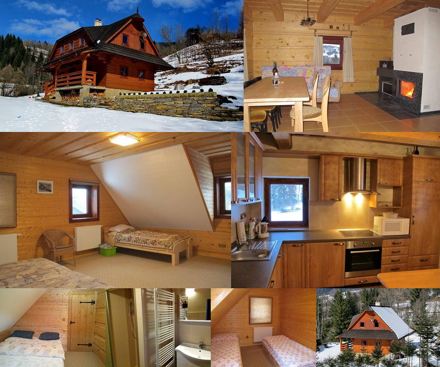 Размещение: Dvojpodlažná drevenica pre 9 osôb (8 lôžok + prístelok), novo postavená v roku 2015. Ponúka ubytovanie najmä rodinám a je prispôsobená najmenším deťom. V chate je štýlová obývačka s krbom, 3 izby (2x2, 1x4 lôžka), plne vybavená kuchyňa, moderná kúpeľňa s WC a druhé samostatné WC. Pri drevenici je terasa a altánok s vonkajším posedením.