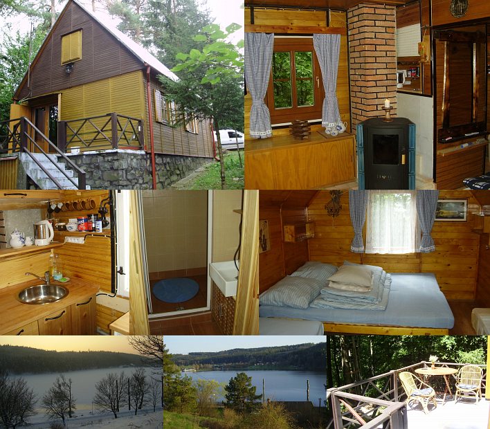 Размещение: Dřevěná chata se dvěma pokoji a terasou. Přízemí: hlavní obytná místnost (rozkládací pohovka, stolek, křesla, TV, DVD, radio s CD, krbová kamna na dřevo, jídelní kout - stůl s lavicí a 4 židlemi), kuchyňský kout (dřez, teplá voda, el. vařič, el. trouba, kávovar, toustovač, sendvičovač, varná konvice, mikrovlnka, lednice, espreso kávovar), WC, koupelna (sprchový kout, podlahové topení, topný žebřík, bojler). Podkroví: 3-lůžkový pokoj (TV, DVD). Vytápění: kamna + el. přímotopy. Terasa: 10 m2, orientace na západ, oplocená. Venkovní posezení, ohniště, uzamykatelný sklep. Parkování pro 3 auta.