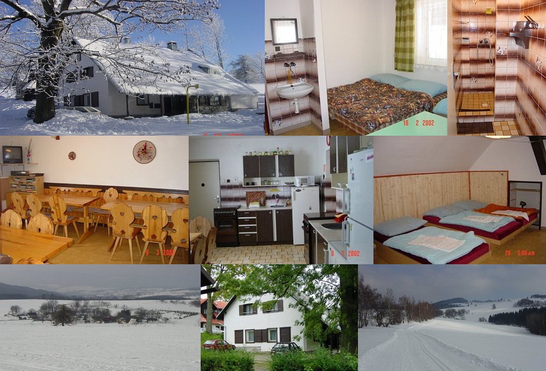 Размещение: Rekreační podniková chata vzniklá rekonstrukcí bývalé hospodářské usedlosti se zachováním původního stylu. Možností přenocování až pro 21 osob v 5 pokojích pro hosty (1x3, 2x4, 2x5 lůžek). Sprchy s teplou vodou a WC jsou společné na patrech. V chatě je společná vybavená kuchyňka (linka, lednice, sporák, nádobí atd.), společenská místnost (TV, společenské hry, posezení pro 20 osob), stolní tenis, vytápěná šatna (sušárna na obuv a oděvy) a lyžárna. Vytápění akumulačními kamny. V chatě se přezouvá do domácí obuvi. Poskytujeme turistické informace o okolí. Možnost soukromé sauny. Parkování možné přímo u chalupy. V zimě je možné zapůjčení sněžných člunů.