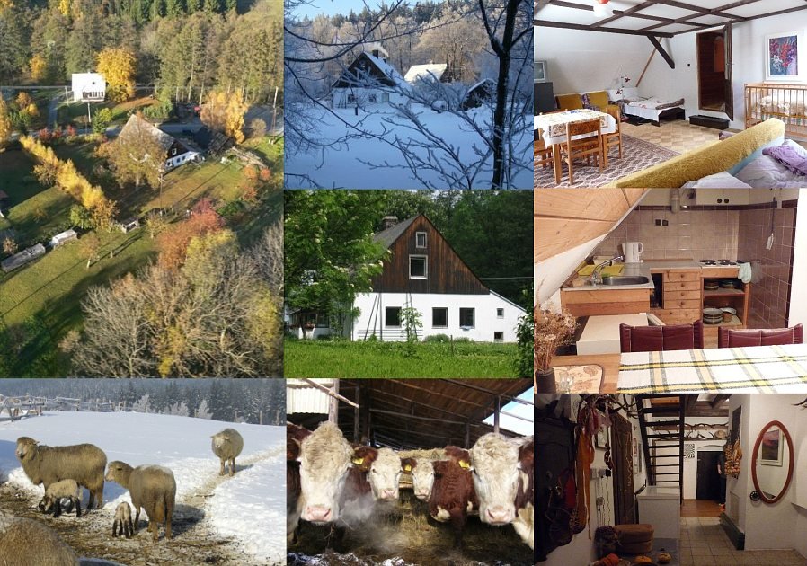 Размещение: Apartmán v podkroví typického 120 let starého jesenického domu. V apartmánu jsou dva 2-lůžkové pokoje (jeden se 2 přistýlkami), koupelna se sprchovým koutem a vybavená kuchyňka. Ve velkém pokoji je TV + video a dětská postýlka. Venkovní posezení s ohništěm, pískoviště, houpačka, bezpečný potok. Ekofarma obhospodařuje louky (kvalitní seno). U sousedů možné koupit mléko a domácí tvaroh, na podzim med a jablka, možnost práce na farmě, jízdy na koni, půjčování sportovních potřeb, sběr léčivých rostlin, praní prádla, převoz hostů a zavazadel.