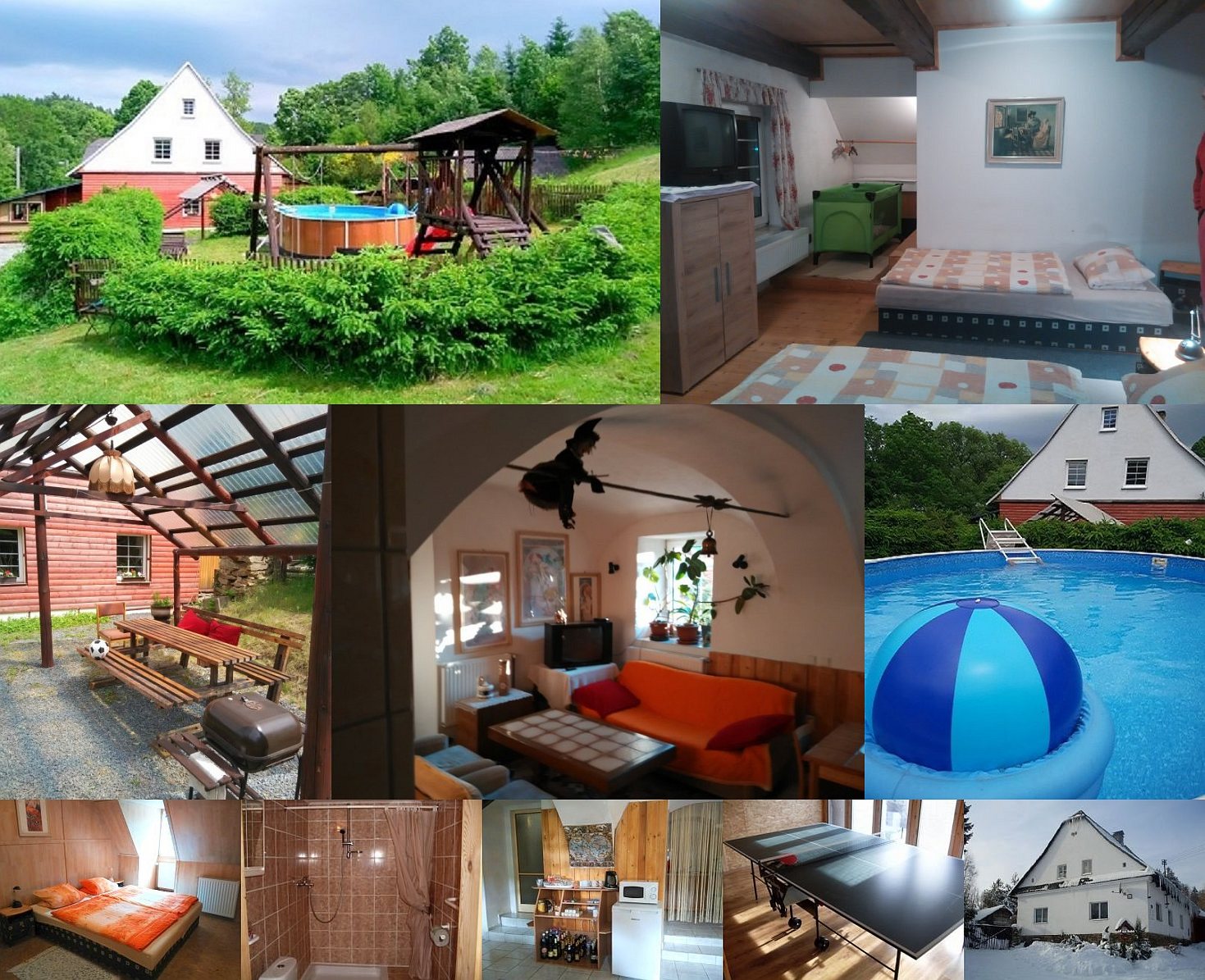 Размещение: Chalupa s kapacitou 9 osob, vzniklá přestavbou středověkého statku se zachováním původních prvků jako jsou klenby a trámy. V přízemí je společenská místnost s TV a posezením pro 6-9 osob, plně vybavená kuchyně. V podkroví jsou 3 ložnice (2-, 3- a 4-lůžková), každá s vlastní koupelnou. Bezplatné WiFi připojení. Vedle chalupy je vlastní parkoviště, z kterého se vchází přímo do předsíně (sušárna bot a oděvů, kočárkárna). U chalupy je menší oplocená zahrada s pergolou a posezením na zastřešené terase. Pro děti máme trampolínu, houpačky, skluzavku a pískoviště. V létě venkovní vyhřívaný bazén (za příplatek). Rádi zapůjčíme sportovní potřeby (tenisové rakety, kola, koloběžky, sáně, boby atd.).