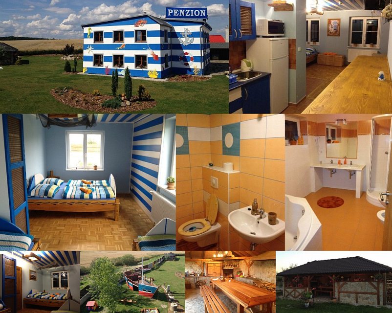 Размещение: Rodinný penzion v námořnickém stylu. 2-lůžkové pokoje s možností 2 přistýlek a 4-lůžkový apartmán s možností 4 přistýlek. Každý pokoj i apartmán má vlastní koupelnu (WC, sprcha, fén, pračka, sušička), wifi, TV, DVD. Apartmán má vlastní kuchyň (varná deska, mikrovlnka, varná konvice, lednice) a terasu, pokoje mají stejně vybavenou kuchyň společnou. U domu je velká oplocená zahrada (4.000 m2, pískoviště s hračkami, trampolína, dřevěná maketa lodi s houpačkou, skluzavkou a prolézačkami), pergola pro 30 osob. Penzion je nekuřácký. Možnost ubytování se psem po dohodě. Možnost snídaní. Uložení kol, lyží, kočárků.