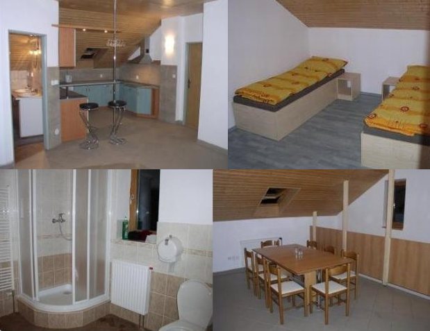 Размещение: Penzion s kapacitou 24 osob ve 3 apartmánech. V každém apartmánu je vlastní kuchyňský kout (sporák, lednice, myčka nádobí, mikrovlnka, rychlovarná konvice, nádobí), soc. zařízení (WC + sprchový kout) a možnost připojení k Internetu. První apartmán má 3 pokoje s celkovou kapacitou 10 lůžek (2+3+5 lůžek) + případně 2 přistýlky. Druhý apartmán má 3 pokoje s kapacitou 10 lůžek (3+3+4). Třetí apartmán má 1 pokoj se 4 lůžky.