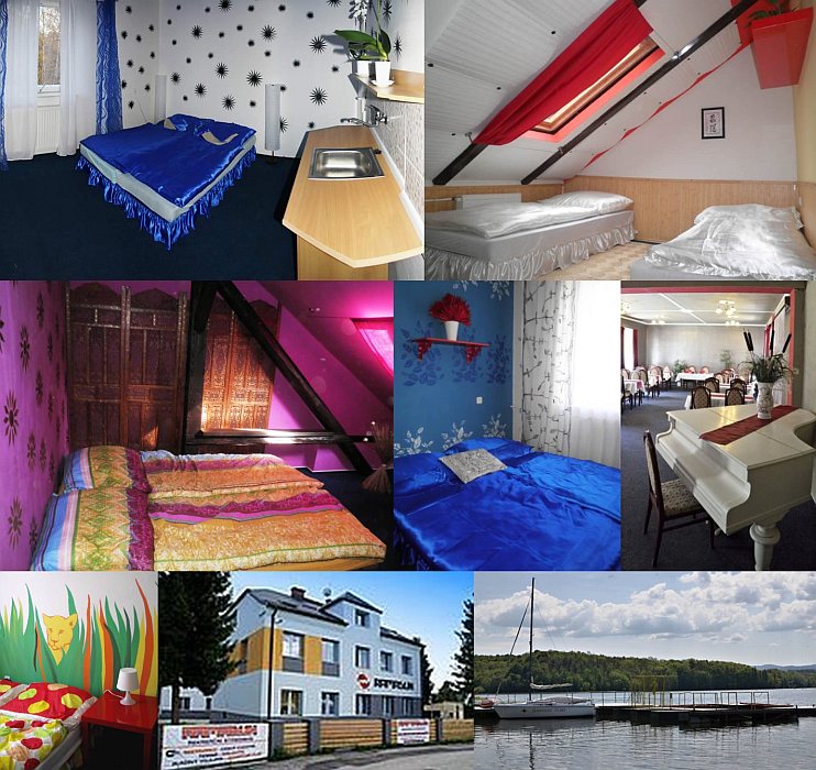 Размещение: Penzion s pokoji v orientálním stylu, s partnerskými motivy i pro rodiny s dětmi. V penzionu je 15 pokojů (2x1, 10x2, 1x3, 2x6 lůžek). Každý pokoj je originálně zařízen studenty fakulty umění Ostravské univerzity. Pokoje mají vlastní soc. zařízení a wifi. V areálu je restaurace (možnost penze), bufet, altánek pro venkovní posezení, ohniště, krb, hřiště pro míčové hry, venkovní dětský koutek, úschovna kol a lyží, stolní tenis, parkoviště a molo. Možnost pronájmu plachetnice, motorového člunu a využití soukromé tiché pláže. Penzion je vhodný pro pobyty rodin, párů, školy v přírodě, rodinné oslavy, školení i soustředění sportovců.