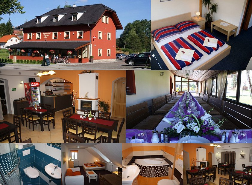 Размещение: Moderní penzion s kapacitou 28 lůžek v nekuřáckých pokojích a apartmánech. Pokoje jsou 2- a 3-lůžkové, s vlastní koupelnou a bezplatným WiFi internetem. Apartmány jsou 4-, 5- a 6-lůžkové a mají navíc i kuchyňský kout. Možnost dětské postýlky. Součástí penzionu je nekuřácká restaurace s krbem a zasklenou terasou (kapacita až 75 osob). Před penzionem je parkoviště a dětský koutek (houpačka, skluzavka). Uzamykatelné prostory na kola a lyže.