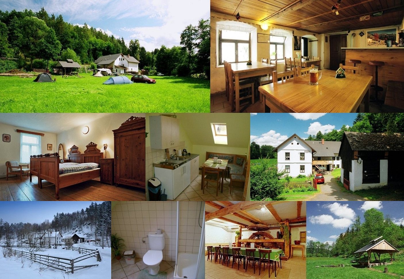 Размещение: Stylově zrekonstruovaný mlýn s penzionem, sezónním kempem a hospůdkou (pivním barem). V penzionu jsou tři 5-lůžkové apartmány, každý s obytnou kuchyňkou, koupelnou, WC a dvěma pokoji (2- a 3-lůžkovým). Možnost přistýlky i dětské postýlky. Hospůdka se nachází v bývalé mlýnici se zachovaným palečním kolem, možnost snídaní. Společenská místnost s kulečníkem, stolním tenisem a šipkami. Bezplatné WiFi. Venkovní posezení na dvorku a na terase. Za mlýnem je upravená louka s altánkem, pískovištěm, houpačkami, možností stanování i grilování. Může sloužit i jako přírodní hřiště.