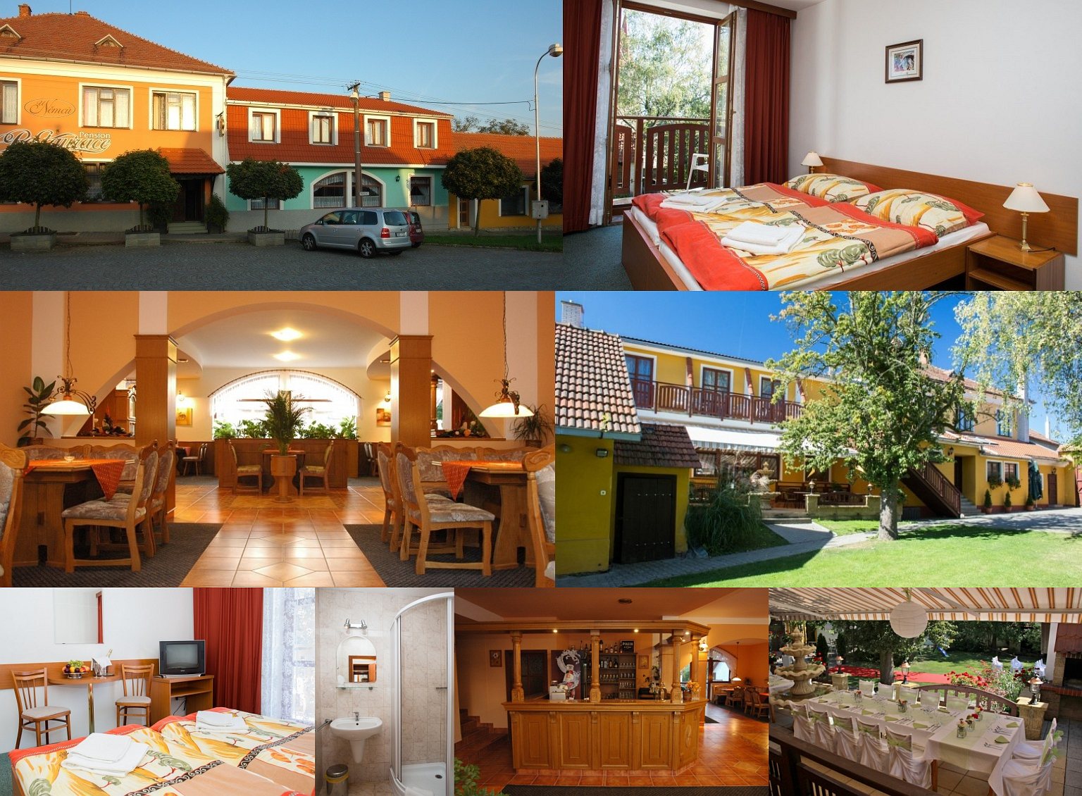 Размещение: Penzion navazující na dlouhou historii zájezdního hostince. Původní část: společné soc. zařízení (WC, sprcha), umyvadla na pokoji. Pokoje 3x2, 2x3, 1x4 lůžka. Nová část: 7x 2-lůžkový pokoj s vlastním soc. zařízením (umyvadlo, sprcha, WC), některé pokoje s balkonem a výhledem do zahrady. Možné zapůjčení TV. Parkování ve dvoře. Nekuřácká restaurace s krbem (60 míst). Kuřácká restaurace (60 míst + 10 míst v salonku, kulečník, projekce na plátno). Sál (120 míst k sezení, pořádání oslav). Posezení pro 30 lidí na terase. Uzavřená zahrada s dětským hřištěm.