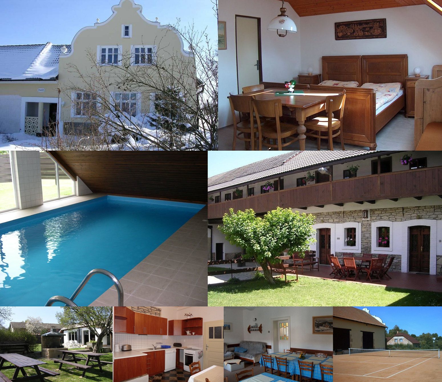 Размещение: Penzion ve zrekonstruovaném stavení barokního statku z minulého století. Vlastní krytý vyhřívaný bazén 4x8 m, stolní tenis, koš na košíkovou, antukový tenisový kurt, travnaté hřiště. V penzionu je 6 útulných pokojů (2x2, 1x3, 2x4 lůžka) a 1 apartmán (1x5 lůžek), každý pokoj i apartmán má vlastní soc. zařízení. Společná plně vybavená kuchyňka (lednice s mrazáčkem, el. sporák, myčka, mikrovlnka, varná konvice, topinkovač). Prostorná jídelna, možnost domácí polopenze. Společenská místnost se samoobslužným barem, kde si můžete načepovat pivo. Uzavřený dvůr s posezením a možností parkování. V zahradě za domem je gril a dětský koutek.