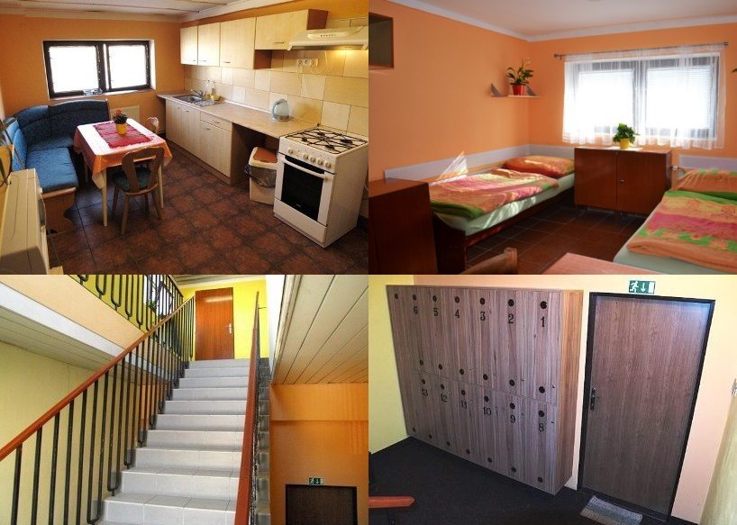 Размещение: Ubytovna s 2- až 4-lůžkovými pokoji. Každý pokoj je vybaven postelemi s přikrývkou, polštářem a povlečením, nočními stolky s lampičkami, žaluziemi, topením, šatní skříní, stolem a židlemi. Společné jsou 2 kuchyňky (elektrický sporák, trouba, lednice, mrazák, mikrovlnka, rychlovarná konvice, nádobí), společenská místnost (TV), sociální zařízení (4 sprchy, 4 umyvadla, 4 WC, pračka, sušička). V ubytovně je wifi. Na chodbě je uzamykatelný botník. V přízemí je nekuřácká restaurace (levná menu).
