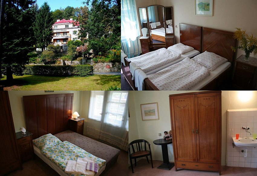Размещение: Penzion vybavený prvorepublikovým nábytkem. Pronájem dvou samostatných pater. 1. patro: 4x 2-lůžková ložnice (dvě jsou s balkonem), 2x WC, 1 koupelna, kuchyň, infrasauna. 2. patro: 4x 2-lůžková ložnice (dvě jsou s balkonem), 2x WC, 1 koupelna, masérna, ordinace lázeňského lékaře.